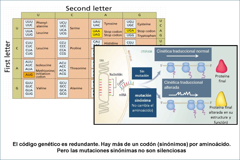 Mediante una maquinaria compleja, las células de los organismos vivos se multiplican para formar diferentes poblaciones, tejidos, órganos y sistemas, actividad que desarrollan las proteínas. La expresión génica es el flujo de información desde los genes hasta la síntesis de proteínas que permiten el funcionamiento celular. Este proceso sigue las reglas del código genético, el cual especifica que cada aminoácido está codificado en el ADN por secuencias de tres nucleótidos llamados codones. Hasta hace poco se creía que la “redundancia” del código genético –es decir, más de un codón para un mismo aminoácido- tenía por objeto asegurar que frente a una mutación puntual, como el cambio de un nucleótido por otro, diera la posibilidad de no alterar el aminoácido incorporado y se preservara la secuencia de la proteína. De ahí que un cambio sinónimo se denominara como “mutación silente”.