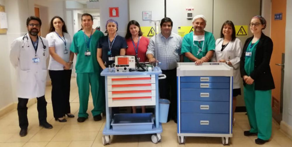 Un carro de procedimiento, otro de anestesia y un monitor desfibrilador fueron entregados a la Unidad de Hemodinamia del Instituto Nacional del Tórax por la Dirección Clínica de la Facultad de Medicina, en una actividad que se realizó el 24 de enero de 2020.