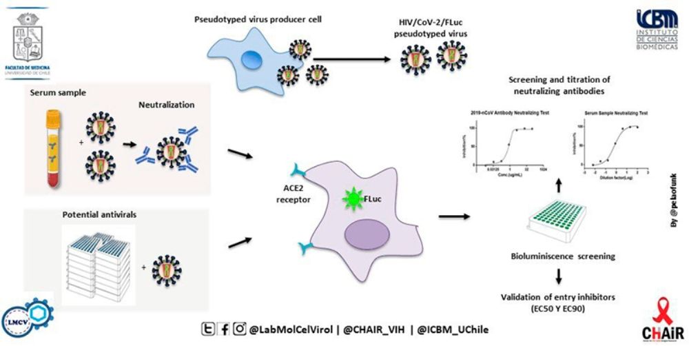 El modelo –hasta el momento único en Chile- es barato, rápido y altamente sensible. Utiliza un pseudotipo viral, basado en VIH y en la proteína spike de la superficie del coronavirus, que emula la entrada de este patógeno a la célula. “Está diseñado para que emita una luminiscencia que podamos cuantificar. Una de las grandes ventajas además es que lo pudimos miniaturizar para hacer detecciones en múltiples muestras a la vez”, explica el investigador.