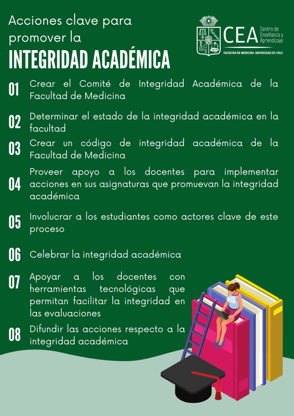 A ello, el doctor Marcos Rojas, director del CEA, agrega que “hasta ahora este es un tema que cada docente o cada escuela de pregrado ve cómo lo puede aplicar, no es algo estandarizado como sí hemos visto en otras instituciones de educación superior o los centros de integridad académica en el mundo. Así pensamos que, en el marco que ofrece la formación profesional a distancia que debemos impartir producto de la actual pandemia, esta es una oportunidad para instalar esta necesidad, con un enfoque centrado en la promoción y prevención, y generando documentos que creemos son insumos importantes para los docentes, como serán el Código de Integridad Académica de la Facultad de Medicina, que contendrá un código de honor al cual adherir. En la actual crisis es importante hablar de la confianza, de la justicia, de la honestidad y la responsabilidad, lo que ha dado pie para que debamos conversarlo con toda nuestra comunidad, porque esperamos integridad de académicos, funcionarios y estudiantes”.