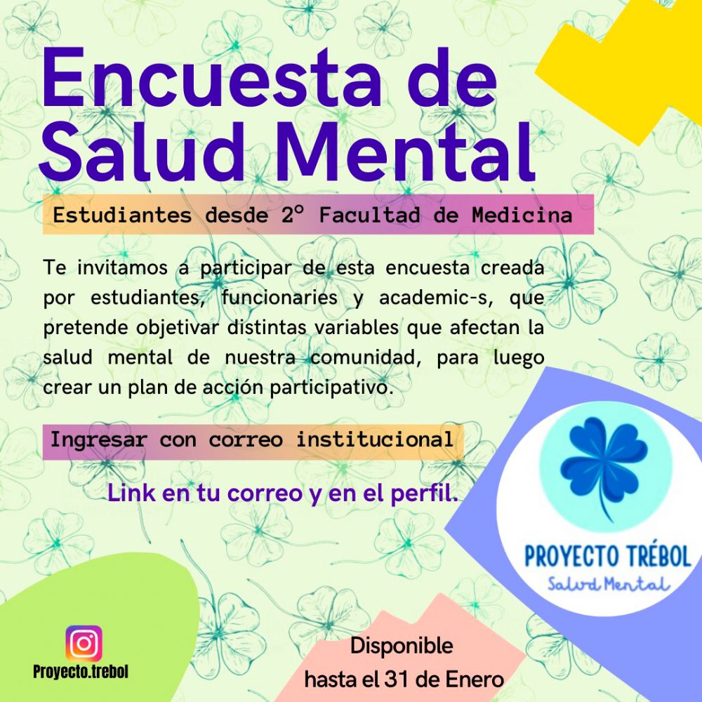 Desde el 18 de enero y hasta el 31 de este mismo mes estará disponible la encuesta del Proyecto Trébol, estudio transversal de autoaplicación en línea dirigido a estudiantes de las carreras de pregrado de la Facultad de Medicina que cursen desde 2do año en adelante, excluyendo a los que ya se encuentran en etapa de internado, por lo que el universo es de aproximadamente 2.800 jóvenes.