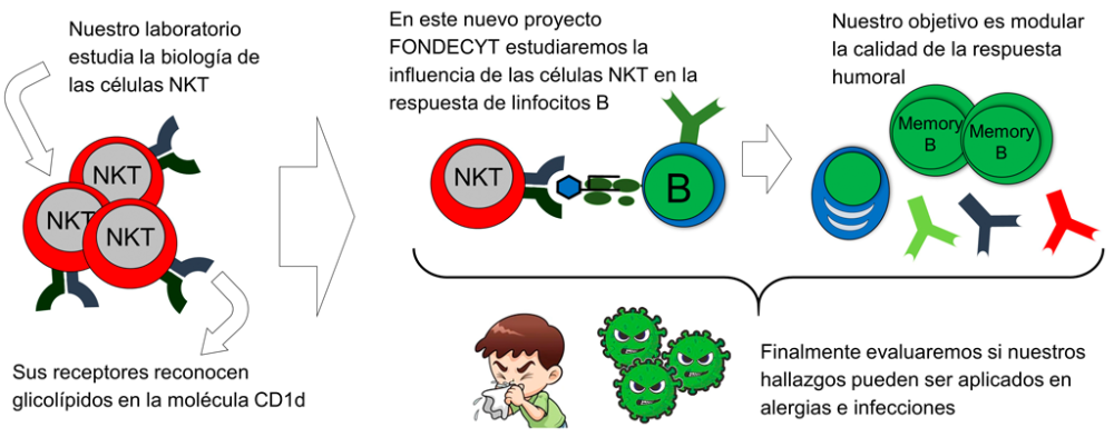 “En el proyecto trataremos de entender la conversación entre las células NKT con los iniciadores de respuesta de anticuerpos, que son los linfocitos B, células especializadas del sistema inmune que juegan un rol importante en la respuesta humoral, la cual es una respuesta clave para defendernos contra infecciones, pero también tienen un papel fundamental en enfermedades autoinmunes y alergias. Nuestro objetivo es poder, racionalmente, modular cómo queremos que se produzcan los anticuerpos y cuál es la memoria inmunológica de estas células que se generan; por ejemplo, si son de mayor o menor duración. Es decir, estamos hilando fino: queremos ver cómo las células NKT, al ser activadas de distintas formas, pueden influir en la biología de las células B, tanto en su memoria inmunológica, en la cantidad y tipo de anticuerpos que se producen, así como en su calidad, relacionada con la fuerza de unión con que se une el anticuerpo al antígeno”.