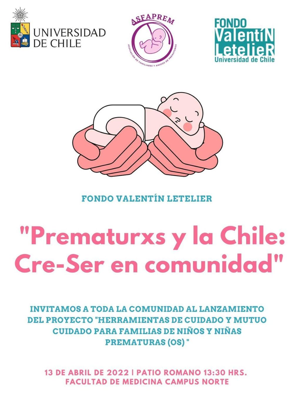 Según explicó, el proyecto “Herramientas de cuidado y mutuo cuidado para las familias de niños y niñas prematuros(as)” motiva el trabajo de 37 personas, entre académicos, estudiantes y funcionarios de los departamentos de Fonoaudiología, Kinesiología, Terapia Ocupacional, Promoción de la Salud de la Mujer y el Recién Nacido; del Departamento de Pediatría Norte, de la Dirección de Igualdad de Género y de la Escuela de Nutrición, además de personal de las facultades de Arquitectura y Urbanismo, de Ciencias Sociales y el Instituto de la Comunicación e Imagen. Además, relevó como socios colaboradores a profesionales del Hospital San José y del Comité de Lactancia de la Sociedad de Pediatría de Chile, Sochipe, y como beneficiarios a la Asociación de Familiares y Amigos de Niños Prematuros de Chile, Asfaprem, y a familias de niños prematuros pertenecientes al Programa de Seguimiento del Hospital Roberto del Río.