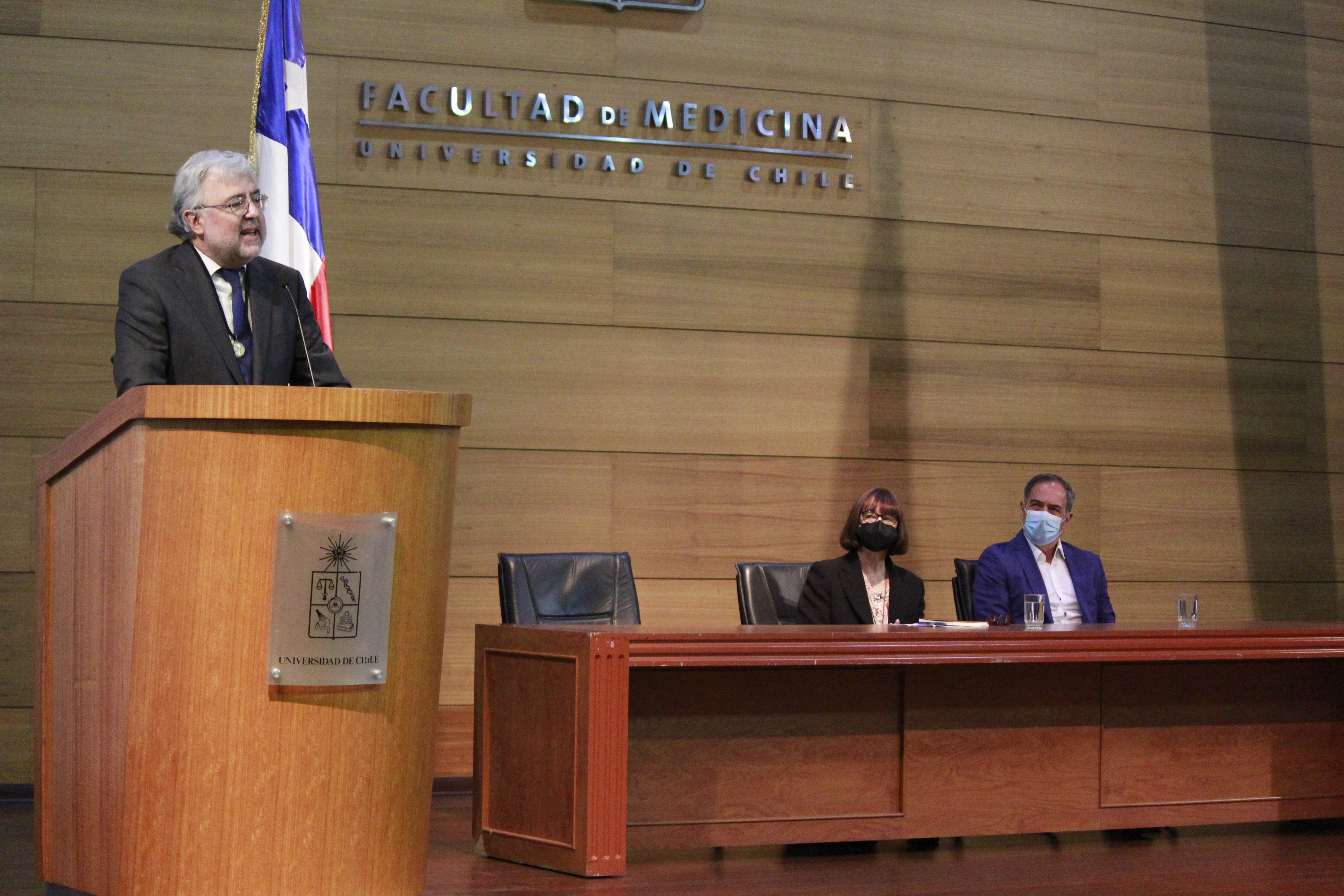 Luego, compartió los motivos que lo guiaron durante su gestión de ocho años; “para mí uno fundamental es que creo en el progreso, como el conjunto complejísimo de procesos que han llevado a la humanidad a escapar de las miserias que la han acechado durante siglos o milenios. Somos testigos de un progreso inimaginable en todos los ámbitos de la vida, y tengo la esperanza que puede y debe continuar, como la mayor cantidad de bienestar para la mayor cantidad de personas. Pero no ha ocurrido de manera mágica, sino que se asocia de manera estrecha al pensamiento de la Ilustración, que ha alumbrado la vida de la humanidad; en Chile ese pensamiento ha estado representado, desde los albores de nuestra República, por la obra de Andrés Bello, como es esta universidad y nuestra Facultad como parte de ella. Así, desde su creación, nuestra facultad ha contribuido al progreso de nuestra patria, a través del progreso individual de miles de personas que han tenido una mejor oportunidad al ser estudiantes o al ser académicos, pero que a través del desarrollo de la educación profesional en salud, del conocimiento y su aplicación, de la comprensión de la enfermedad y de las maneras de prevenirla, o de erradicar algunos de los mayores males, han hecho de esta una nación que ha progresado. Nuestra Facultad de Medicina y nuestra Universidad de Chile siguen y deben seguir siendo un instrumento de progreso para las personas que acceden a ella y para toda la comunidad”.
