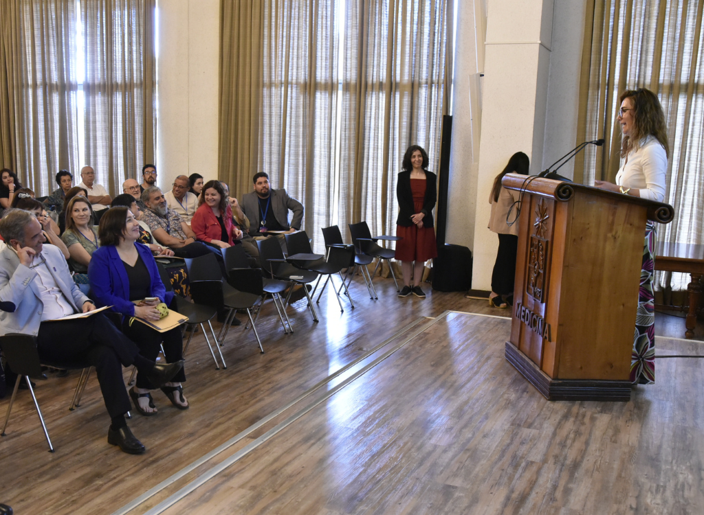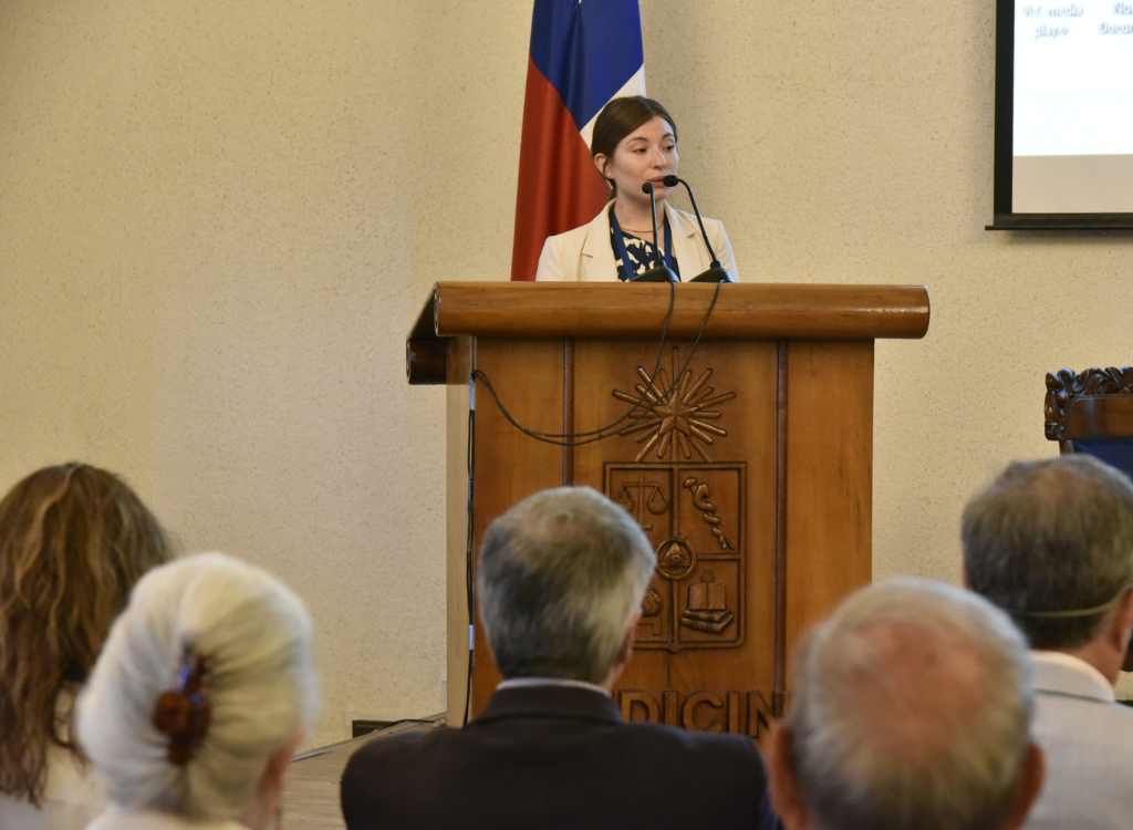 La coordinadora de la Unidad de Egresados y Egresadas — Alumni de la FMUCH, Paulette Celedón, también dirigió unas palabras a los presentes, en las cuales detalló los objetivos y la visión de esta nueva red, haciendo hincapié en el profundo sentido de responsabilidad social que distingue a la institución.