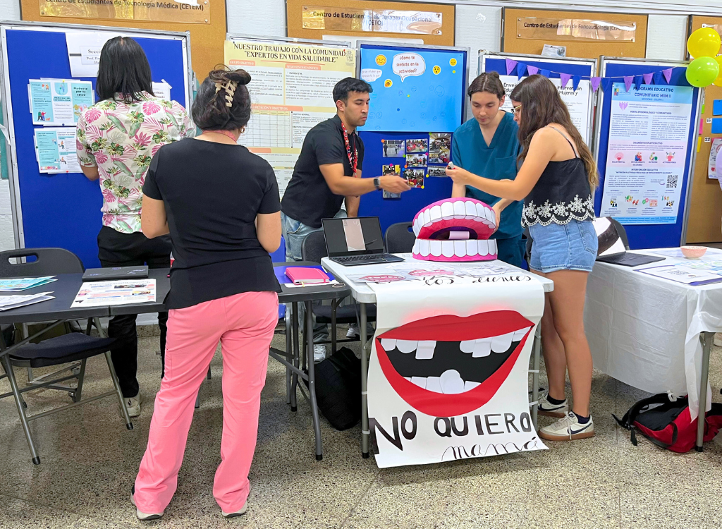 La profesora Mónica Espinoza, directora del Departamento de Educación en Ciencias de la Salud (DECSA) y una de las coordinadoras del evento —junto a la profesora Sandra Oyarzo, también del DECSA—, destacó que esta feria constituye la culminación de un proceso formativo que articula trabajo en terreno, reflexión disciplinaria y colaboración entre futuros profesionales de la salud: “Esta feria representa el cierre de un curso de formación interprofesional basado en proyectos, donde estudiantes de las ocho carreras trabajan colaborativamente para identificar y abordar necesidades en distintas comunidades. Hoy presentan los resultados de los diagnósticos participativos elaborados junto a dirigentes sociales, en un espacio abierto a toda la comunidad universitaria”, señaló.